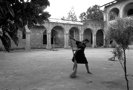 Niña de 13 años que presenció el asesinato de sus padres realiza labores de limpieza en el patio del albergue para niños huérfanos por la guerra interna de la Misión de Ocopa, Junín
